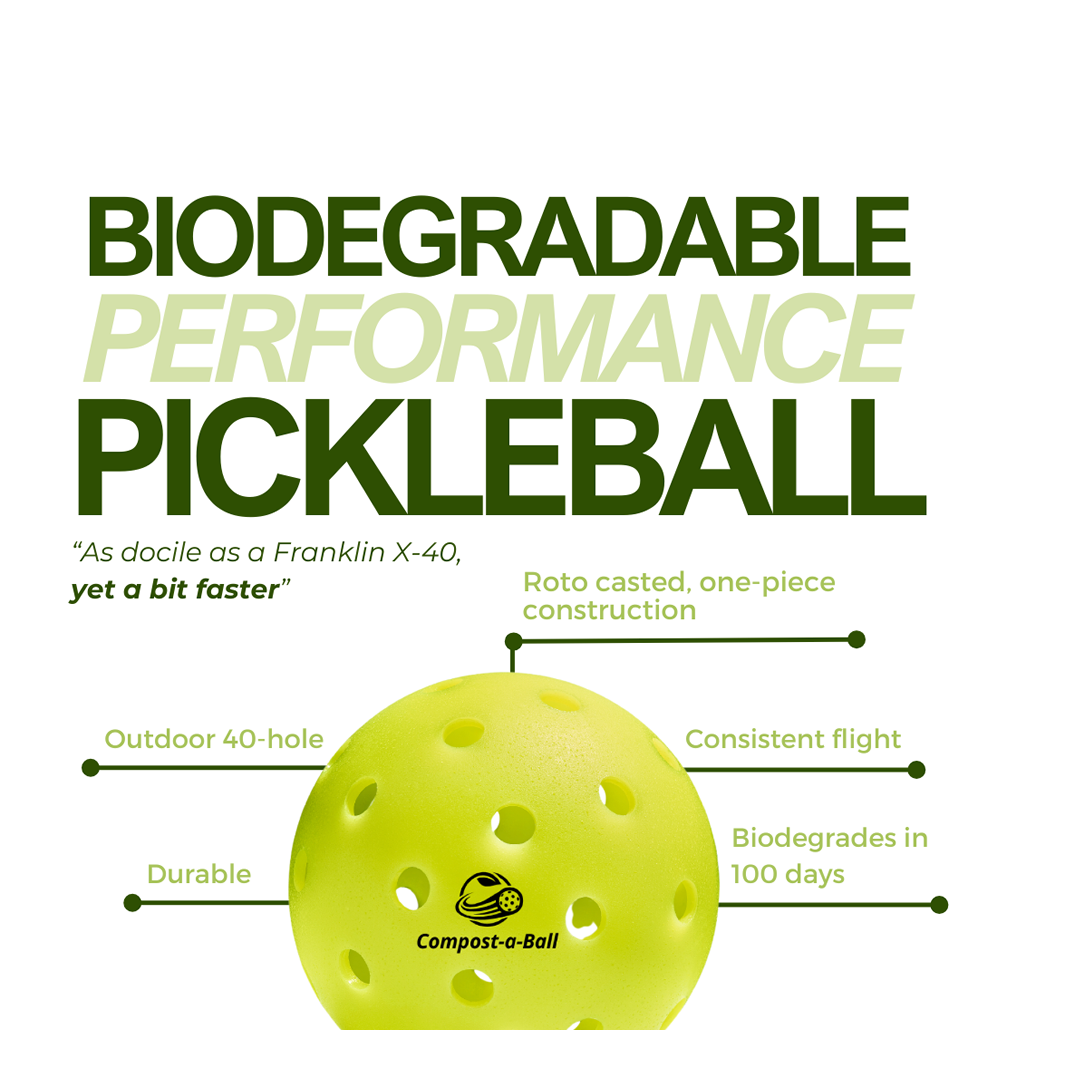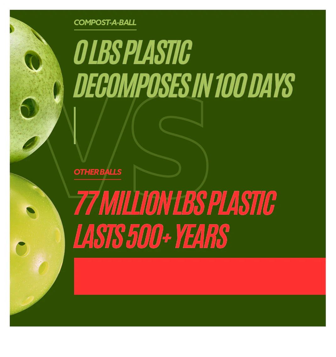 Did you know that the sport of pickleball produces 77 million pounds of plastic every year? Since most plastic is not recyclable, it ends up in landfills and oceans, and takes over 500 years to break down into microplastics that never truly decompose. Compost-A-Ball helps solve this problem by fully decomposing in only 100 days.